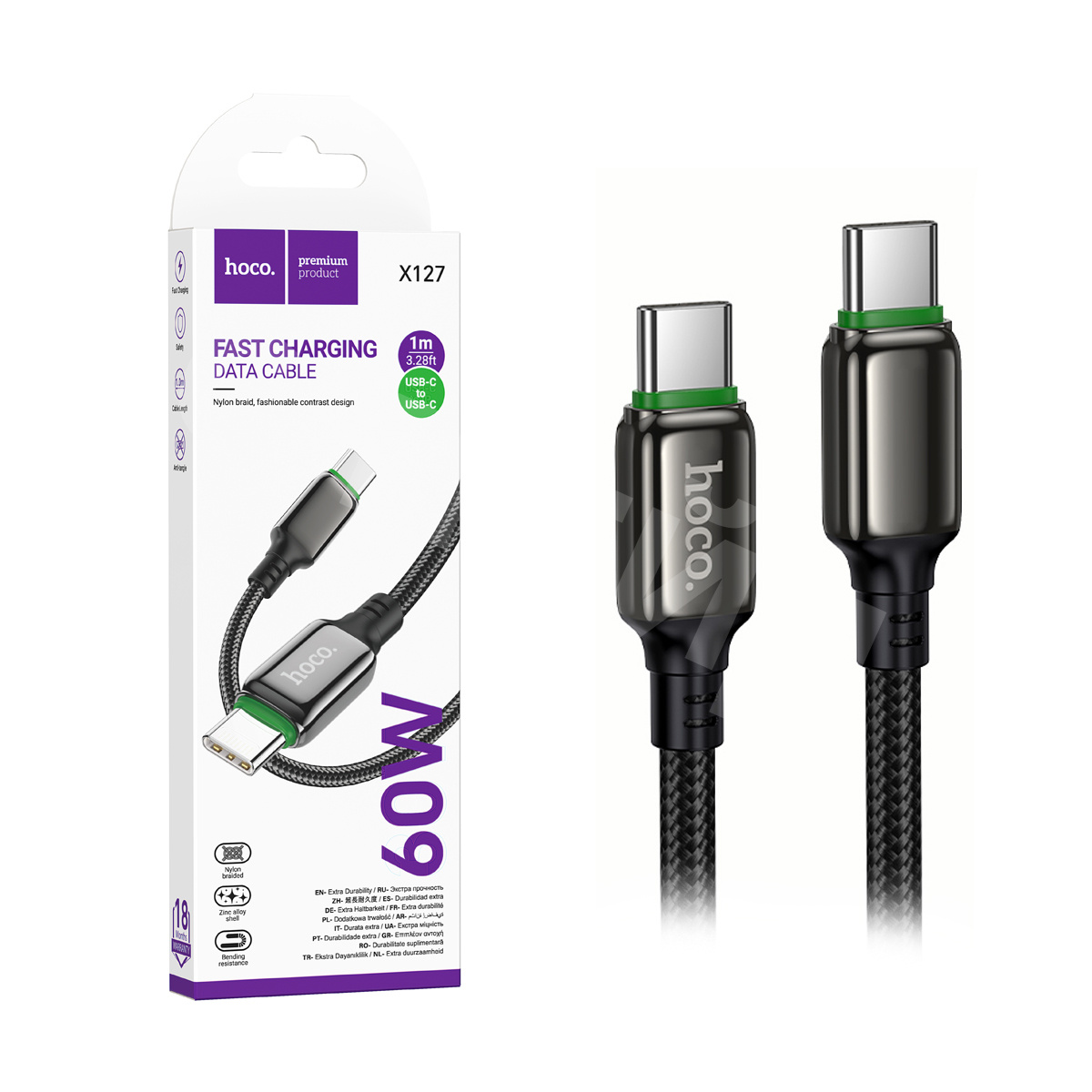 Кабель Type-C - Type-C Hoco X127 (3A, 60W, PD, оплетка нейлон) Черный
