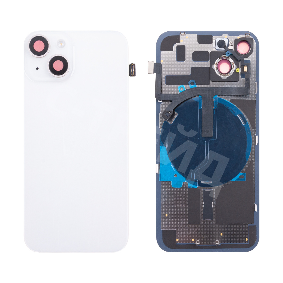Задняя крышка для iPhone 14 (A2883) в сборе со стеклом камеры Белый (стекло, монолит, MagSafe с оригинальным шлейфом, логотип) - Премиум